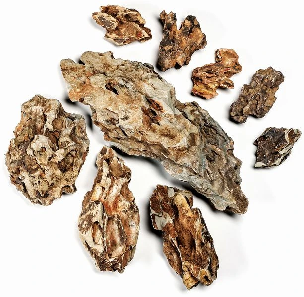 Tolles, interessant geformtes Dekorationsgestein in Braun- Grau- und Rosttönen für Süsswasser-Aquarien und Terrarien. Das Aquascaping Gestein schlechthin – Mit den Drachensteinen nahm alles seinen Anfang! Das praktische Set enthält genügend Steine um ein 60 cm Becken perfekt zu dekorieren, die Anzahl der Steine kann dabei je nach Größe der Einzelstücke variieren.
