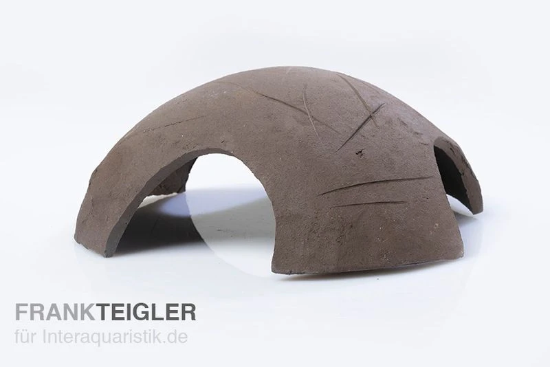Das tönerne Axolotl Iglu von Aquariumkeramik besitzt einen Durchmesser von ungefähr Ø 18 cm bei einer Höhe von zirka 10 cm. Es verfügt über 3 Eingänge/Torbögen mit einer Größe von ungefähr 6 x 6 cm.