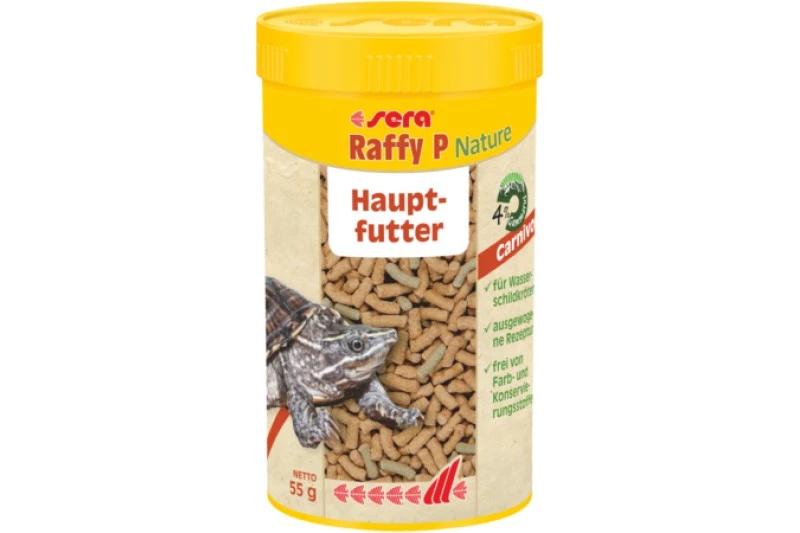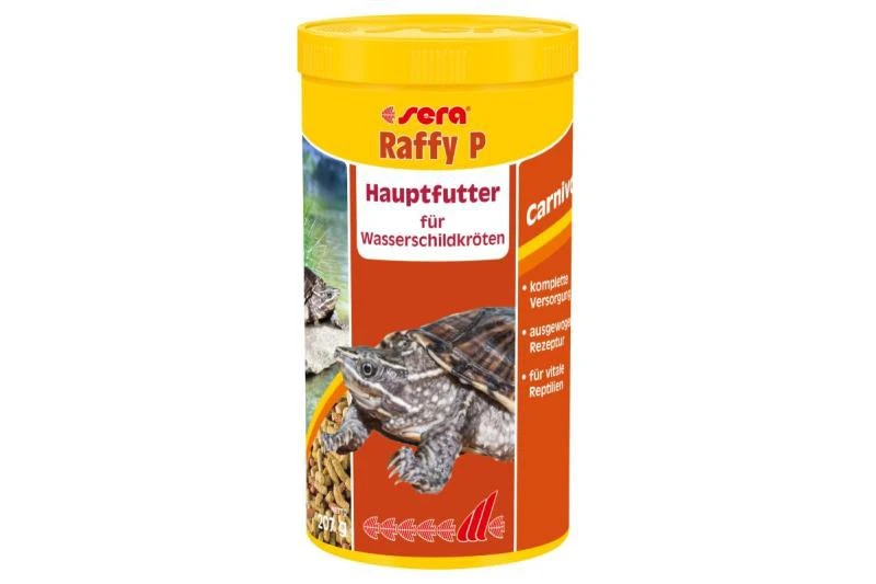 Sera Raffy P aus schwimmendem, schonend hergestelltem Granulat ist das Hauptfutter  für Fleisch fressende Reptilien wie Wasserschildkröten. Die schmackhafte und ausgewogene, Komposition mit tierischen und ebenfalls benötigten pflanzlichen Inhaltsstoffen zeichnet sich durch optimal verwertbares Protein, leicht verdauliche Kohlenhydrate sowie einem hohen Gehalt an Omega-Fettsäuren aus. Die grundlegenden Bedürfnisse der carnivoren Reptilien werden sicher abgedeckt. Ihre Vitalität und gesunde Entwicklung werden gefördert.